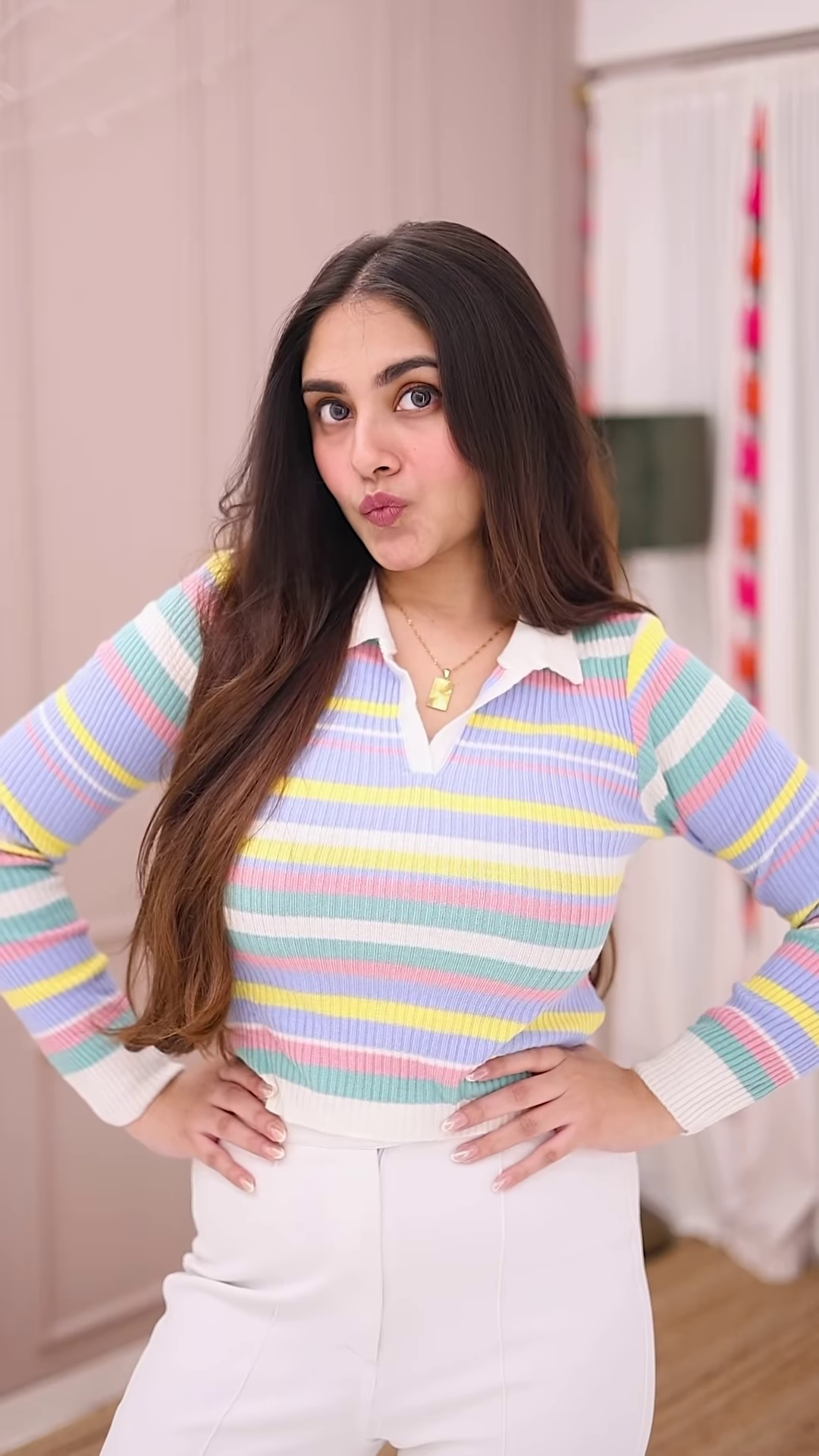 • 🌈 Striped Sweater: Horizontal pastel stripes in blue, yellow, pink, and green with white collar; paired with white pants and gold pendant