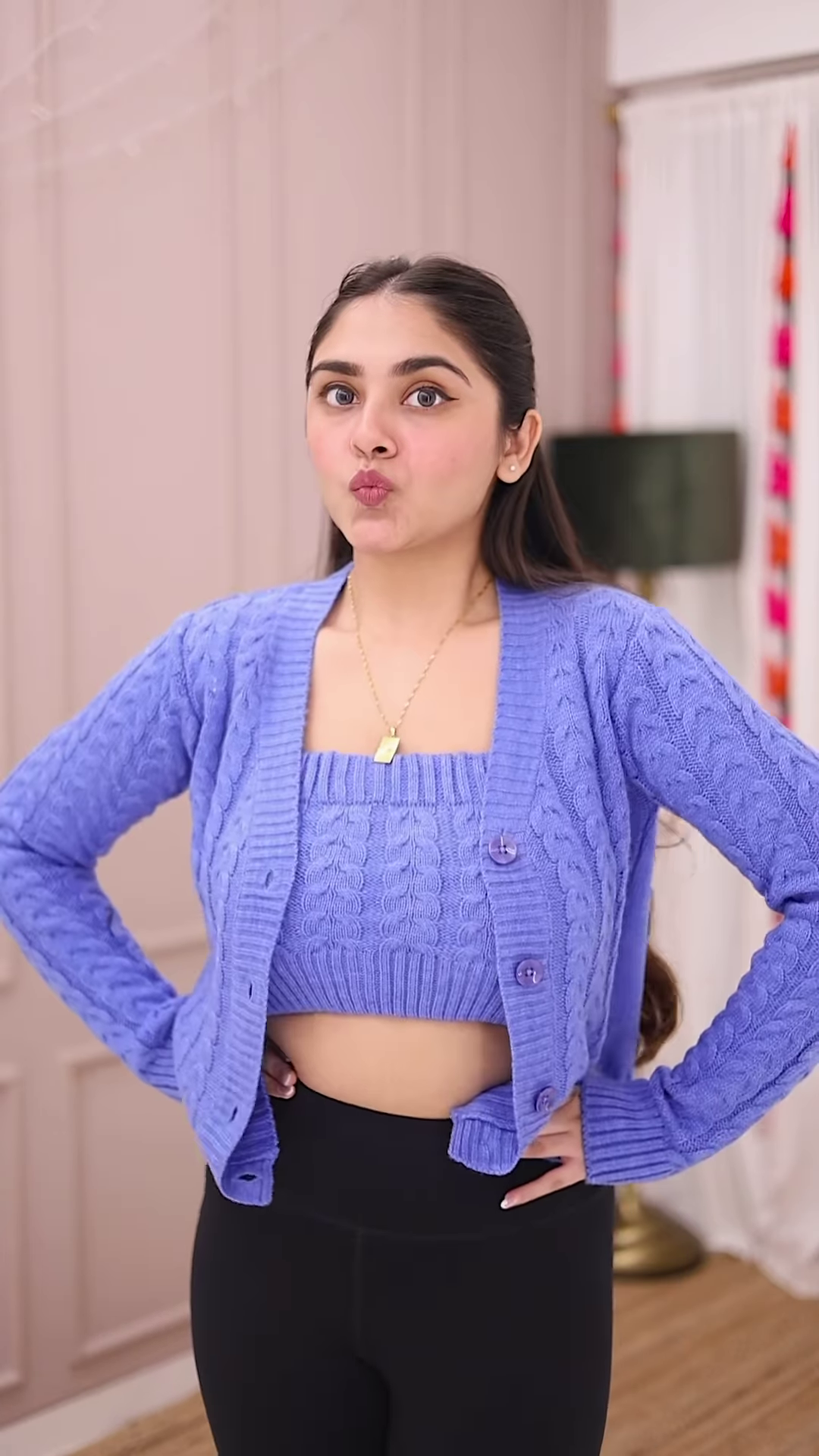 • 🧶 Cable-Knit Co-Ord: Matching blue cardigan and crop top with button detailing; paired with black high-waisted pants